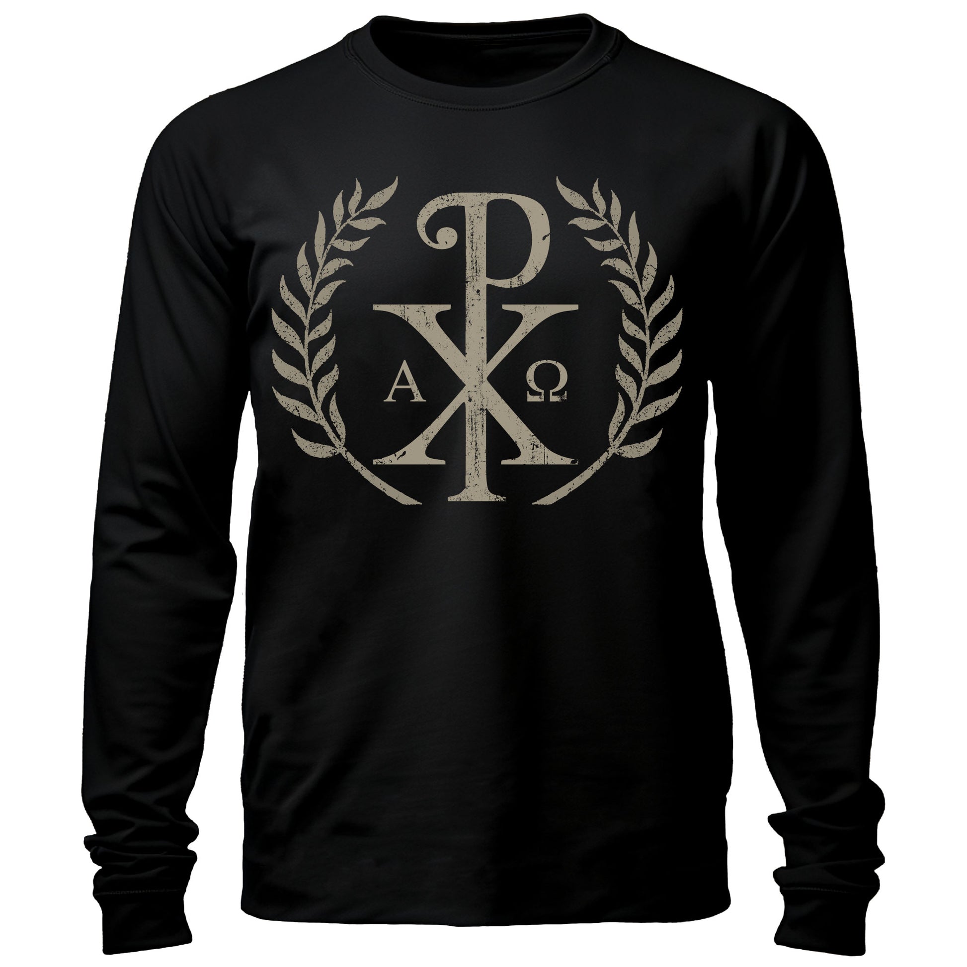 Inspired by the ancient Chi-Rho, this design marks allegiance to Jesus as King. The laurel wreath and Alpha-Omega signal His eternal victory, while the distressed graphic gives the image a rugged look against black. Wear it as a banner of faith and courage. Available as a t-shirt, long sleeve shirt, or hoodie.