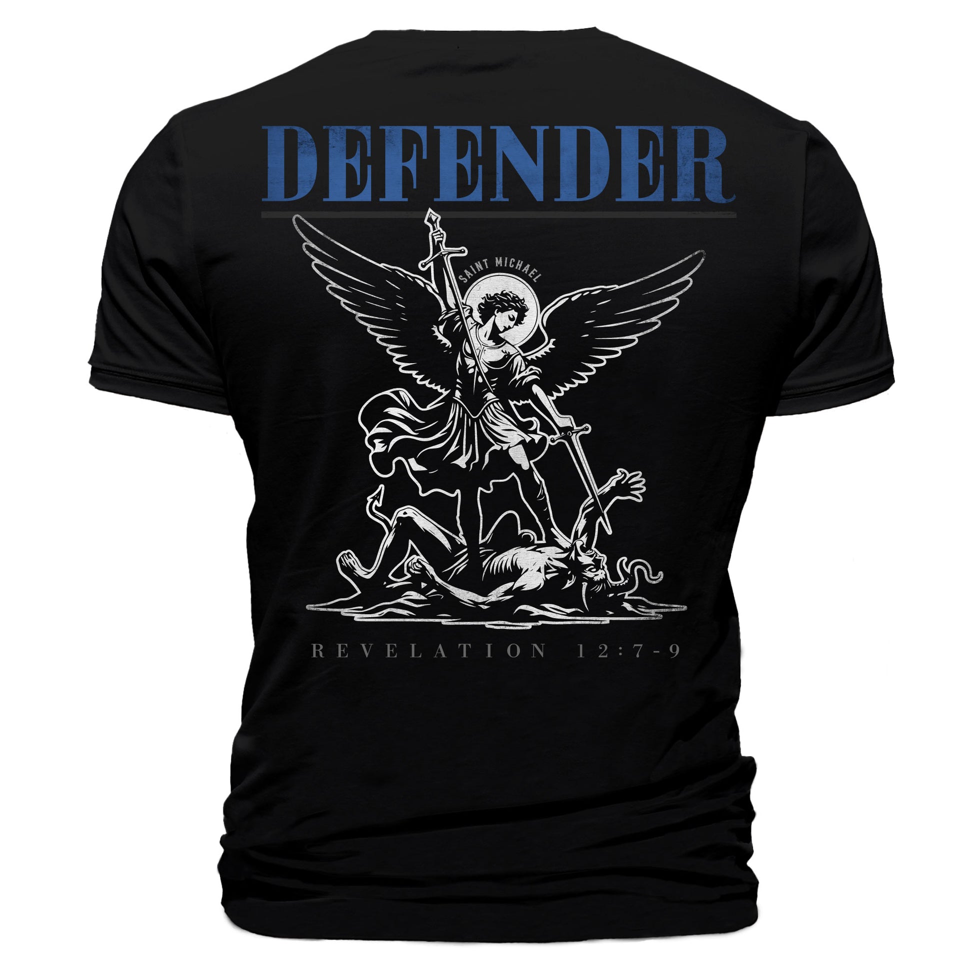 From Revelation 12:7–9, St. Michael The Archangel stands over the dragon—spear planted, victory sealed. The DEFENDER header in deep blue crowns razor-sharp linework on black—clean, rugged, and battle-ready. Wear it as a pledge to guard the weak, resist the enemy, and stand your ground. Available as a t-shirt, long sleeve shirt, or hoodie.