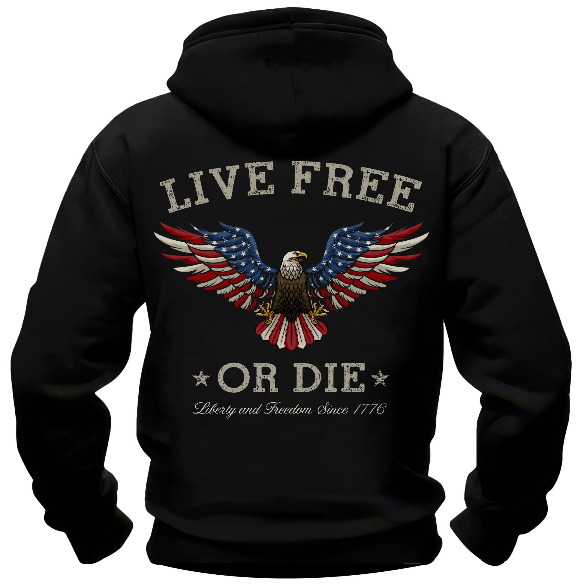 A tribute to liberty and courage, this design features a bald eagle draped in the colors of freedom — wings spread wide in defiance and pride. “Live Free or Die” echoes across the back as a timeless call to those who refuse to bow to tyranny and stand unshaken in their convictions.