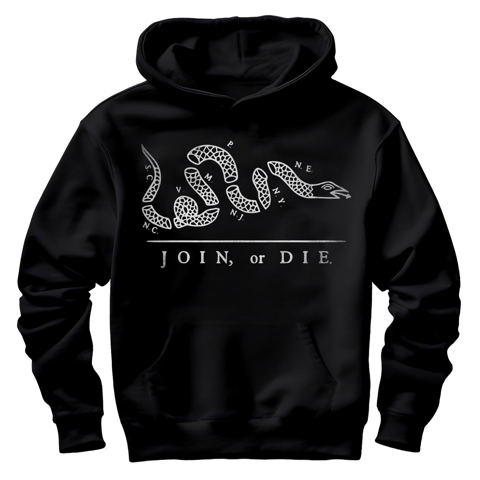 This design features the iconic “Join, or Die” segmented serpent — a timeless symbol of unity, resolve, and the cost of complacency. Bold, simple, and unmistakably American, it carries the spirit of early patriots who stood firm when it mattered most. This design is available as a t-shirt, long sleeve shirt, or hoodie.