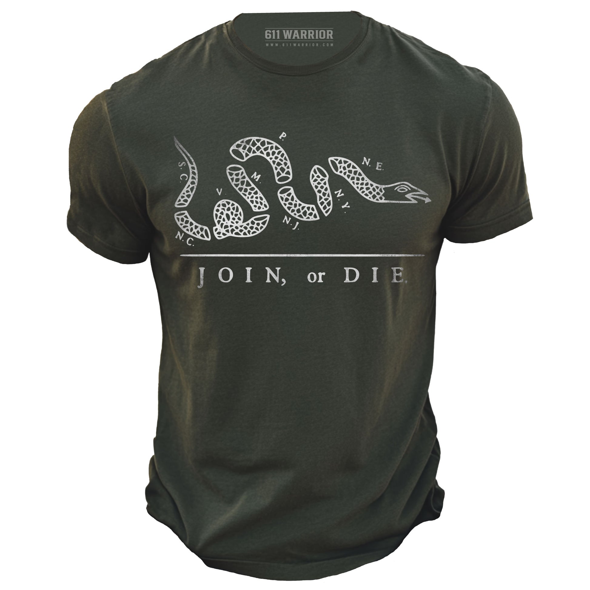 This design features the iconic “Join, or Die” segmented serpent — a timeless symbol of unity, resolve, and the cost of complacency. Bold, simple, and unmistakably American, it carries the spirit of early patriots who stood firm when it mattered most. This design is available as a t-shirt, long sleeve shirt, or hoodie.