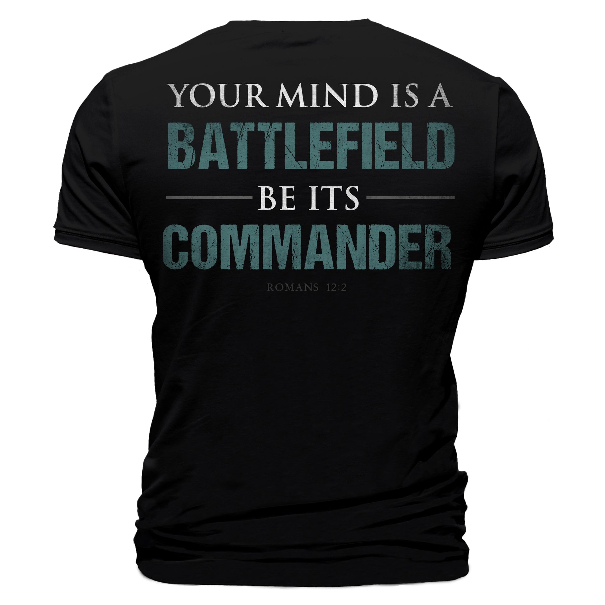 This design confronts the unseen war fought within every warrior. It reflects the truth that strength is forged through discipline of thought, resolve of purpose, and command over fear and doubt. This message reminds us to take responsibility for the inner fight and to stand firm against pressures that seek to weaken conviction. Inspired by Scripture and the warrior mindset, this piece speaks to the strength, resilience, and resolve that is needed to have victory over the battle within. Available as a t-shirt, long sleeve shirt, or hoodie.
