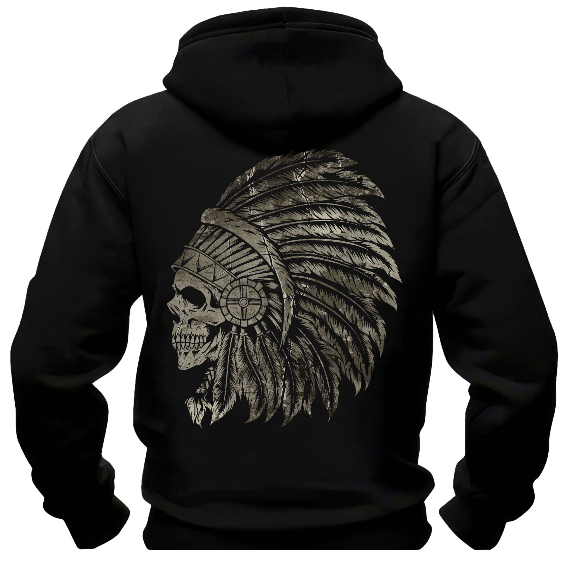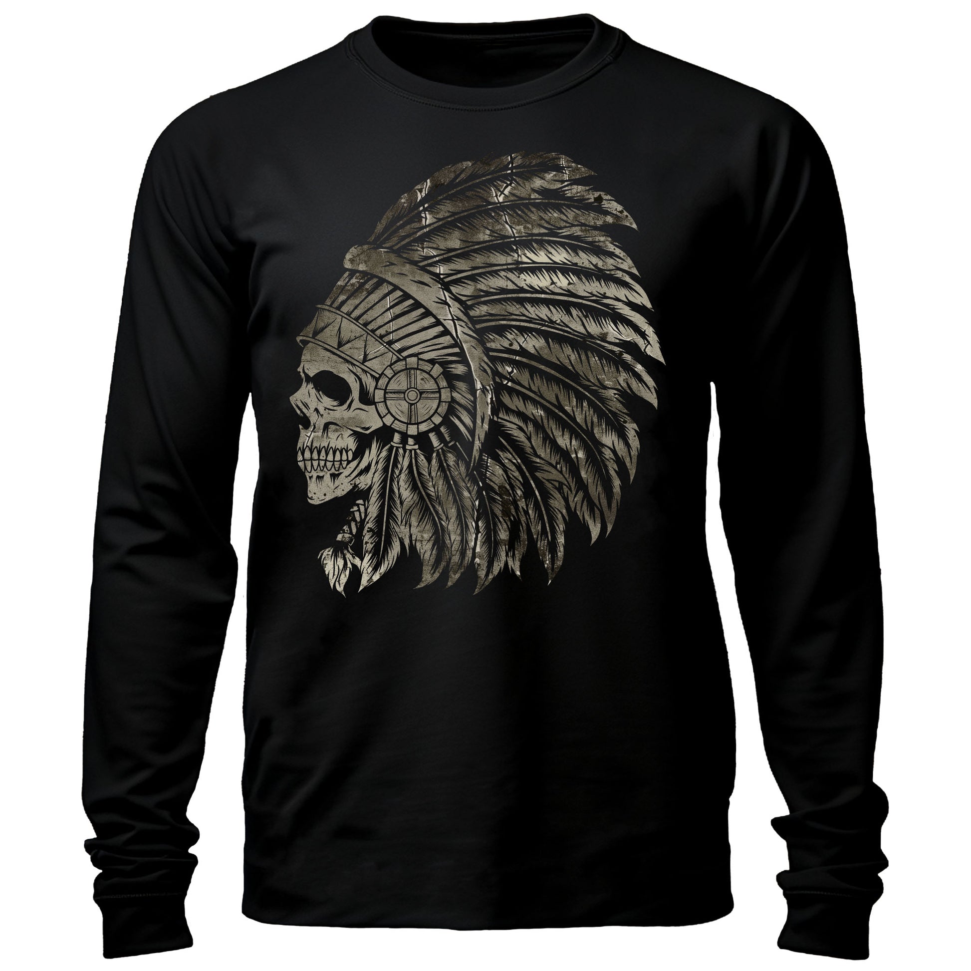 A symbol of courage and unyielding strength, this Native American warrior design features a detailed skull wearing a traditional feathered headdress. The aged and distressed artwork is a reflection of valor, honor, and the eternal will to stand unbroken.