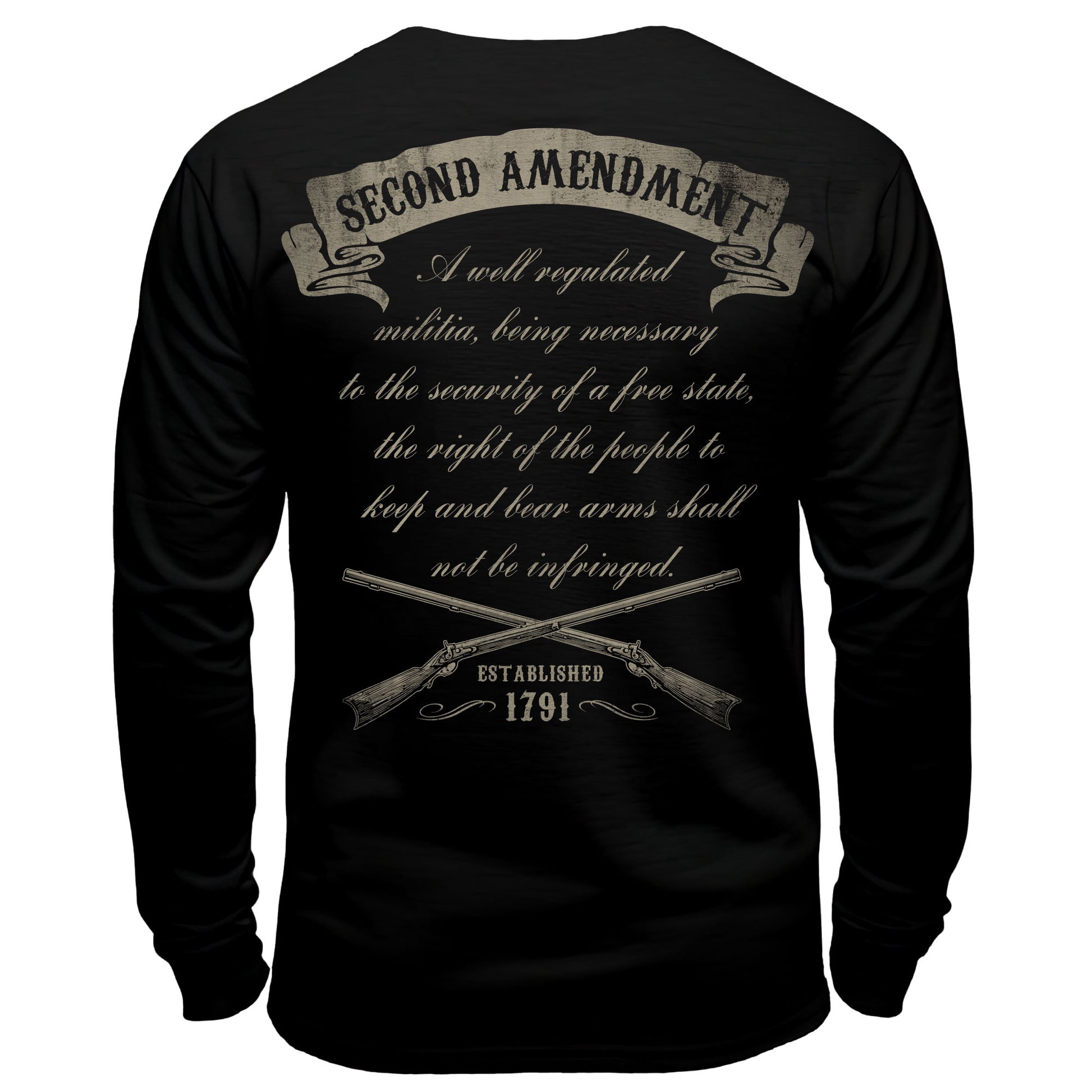 This design pays tribute to the enduring words of the Second Amendment — a declaration of freedom and personal defense written into the fabric of American history. The vintage scroll typography and crossed muskets honor the original spirit of 1791 with a timeless, battle-worn aesthetic. Available as a t-shirt, long sleeve shirt, or hoodie.