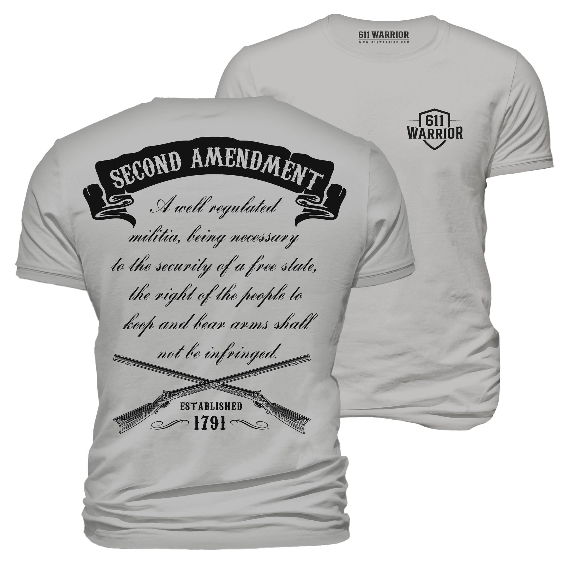 This design pays tribute to the enduring words of the Second Amendment — a declaration of freedom and personal defense written into the fabric of American history. The vintage scroll typography and crossed muskets honor the original spirit of 1791 with a timeless, battle-worn aesthetic. Available as a t-shirt, long sleeve shirt, or hoodie.